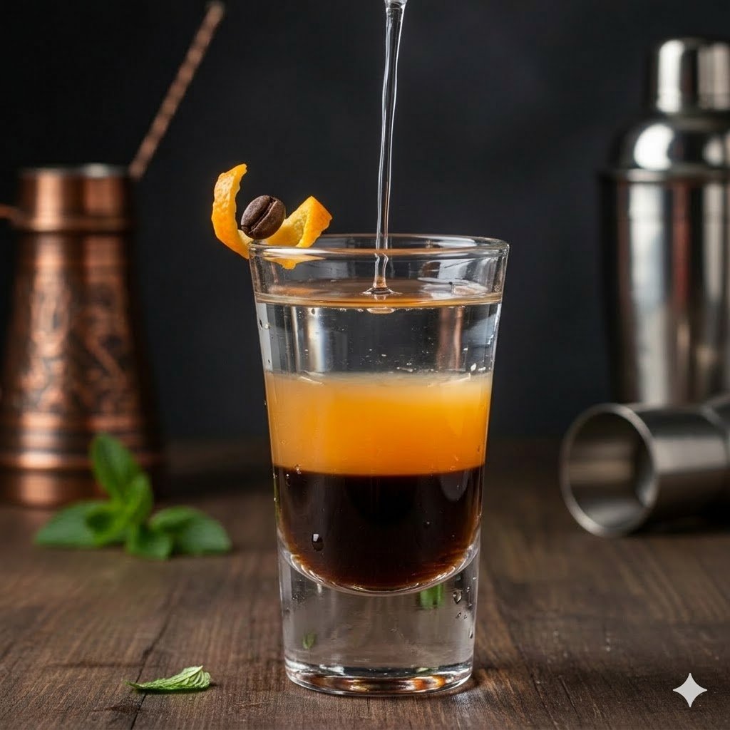 Listelenen malzemeleri sırayla ve dikkatlice bir shot bardağına bar kaşığı yardımı ile ekleyerek katmanlı bir görünüm elde ediyorum.